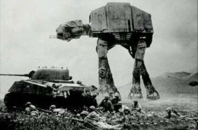 全名All Terrains - Armoured Transport,意为全地形装甲载具,外型就相战争巨兽一样,依靠四条机械腿老支撑,因此AT·AT可以克服大部分履带式战车都无法走过的路段,二战中德军曾投入过战场。