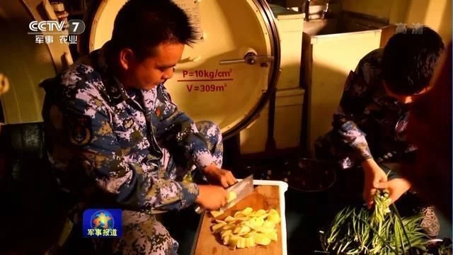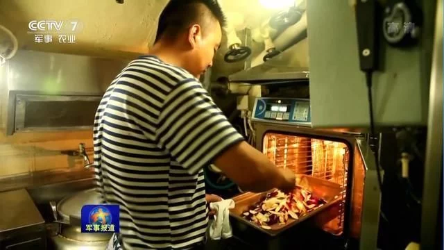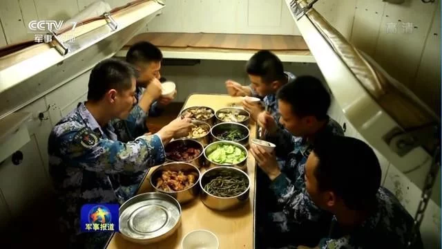 潜艇厨房里面有一个多功能烤箱,因为潜艇上面不能炒菜只能用来烤。它可以用来烤鸡翅,牛肉等食物。潜艇兵执行任务需要高度集中精力,下班后基本身心俱疲,食欲不振。潜艇上只好把吃饭当成必须成的任务:每顿饭吃一碗及格,两碗良好,三碗优秀,不好吃也要捏着鼻子吃。 解放军从建军之日起就严格规定"官兵一致",具体落实到吃饭这个问题上不像一般外军那样军官和士兵分开,而是按照工作地域、性质和岗位的不同将伙食分为四类标准: 一类灶:战士、与战士同餐的军官、国防施工分队和驻生活条件艰苦的边防、岛屿部队;