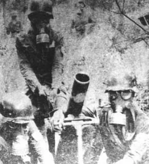 日军的毒气部队正在使用迫击炮发射毒气弹
