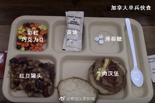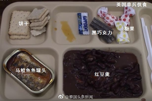 泰国头条新闻评论称,作为一名军人,无论站岗、执勤还是出去执行任务,除了要随身携带武器装备,取食简便、随时补充身体营养所需的军粮也至关重要,毕竟吃饱了才有力气打仗。为了表明这位泰国士兵的伙食差别,这家媒体对比了其他国家的军粮。
