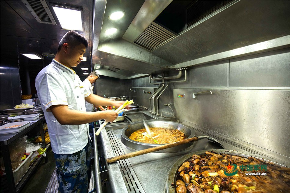 海军南海舰队远航训练的导弹驱逐舰上的厨房要负责近300人的伙食。在远海训练的日子里,厨师一顿饭就要做五菜一汤。直径一米的大锅,铲勺也各是一米多长,炒一回菜,一次要翻动几十斤。