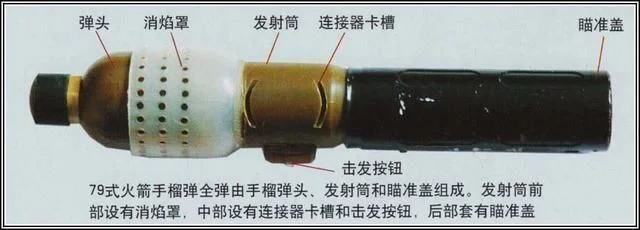 1979年,经过8年的努力,中国军工人员终于在木柄手榴弹的基础上研制出了一种可以解决这些问题的全新武器,这就是79式45毫米火箭手榴弹。从外表来看,79式火箭手榴弹和一枚普通的67式木柄手榴弹十分相似,而其重量为650克,仅比67式重了50克,十分轻便。不过在使用方法上,79式火箭手榴弹却和67式相差甚远。顾名思义,火箭手榴弹就是使用火箭发动机发射的一种手榴弹。79式手榴弹主要由手榴弹头、发射筒和瞄准盖三部分组成,手榴弹弹头采用卵形设计,以减少飞行时的空气阻力,弹体由压有破片刻槽的两片壳体组成,内装TNT炸药。发射筒兼具手持手柄的功能,发射筒装有火箭发动机、操纵杆、击发机和瞄准盖等部件。