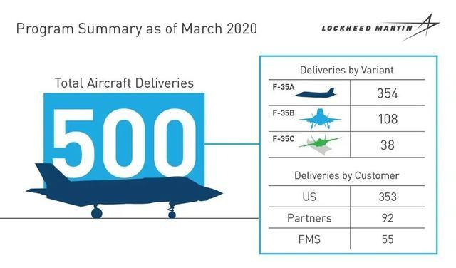 咱们还是先略微盘点一下F-35系列战机的批产和装备现状好了:按照美国官方公布的消息,目前已经交付了的500架F-35中,包括了354架F-35A、108架F-35B、38架F-35C;而在这些战机的分配问题上,美国空军、美国海军、美国海军陆战队装备353架战机,其中包括了229架F-35A、86架F-35B和38架F-35C;JSF计划的“合作伙伴国”(英、澳、加、丹、意、荷、挪八国)拿到92架,还有多个“外销国”(韩国、日本、比利时、新加坡、以色列)拿到了55架。美国三军作为F-35系列战斗机群聊的“群主”,在装备数量和采购计划上遥遥领先众人。