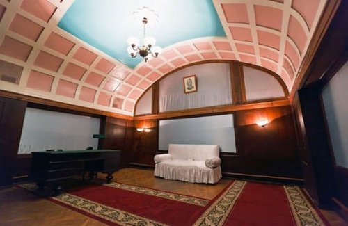 斯大林的休息室高4米,装饰同他克里姆林宫办公室时原一模一样:木地板、橡木墙板、铺着绿色呢的大桌子、带有白灯罩的灯、套着白布罩的沙发。墙上挂着斯大林最崇拜的俄国统帅苏沃洛夫和库图佐夫的像。屋子四周有几扇假门,门得用途谁也说不清。据说,斯大林的克里姆林宫的办公室也有几扇这样的假门。
