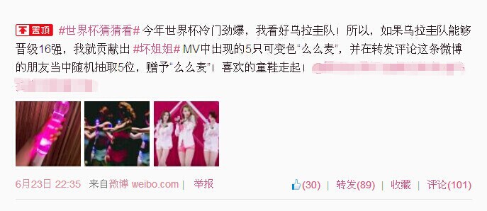 乌拉圭队在本届世界杯的发挥,让许多球迷都捏了一把汗,小组赛第一场大比分负于哥斯达黎加,第二场力胜英格兰,第三场整装待发对决意大利,胜负难辨。乌拉圭队球迷王蓉也是“豪赌”了这场关键比赛,发微博称如果乌拉圭队胜出,她将送出《坏姐姐》MV中拍摄使用的限量版“坏姐姐么么麦”给胜出当日转发微博前五位的幸运粉丝。不久前王蓉发布的《坏姐姐》单曲,使他再度成为乐坛焦点,人气爆棚。“么么麦”在《坏姐姐》MV中凭借炫酷的荧光色成为绝对亮点,五只限量版“么么麦”弥足珍贵,让粉丝们都万分期待,这场比赛也变得更加有关注亮点。