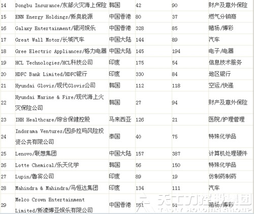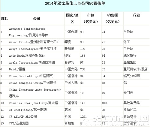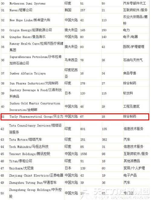 8月28日,《福布斯》公布了“2014亚太地区最佳上市公司50强”榜单,天士力制药集团股份有限公司作为中国唯一一家制药类企业上榜,荣膺“2014亚太地区最佳上市公司50强”称号。