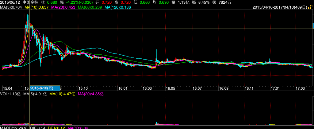我们暂且不讨论这公司为何下跌,先来看看这公司是个“什么鬼”。悠悠先看了一眼K线图,多年股价在1块钱以下,最近两年最高价才不到7毛,如图: