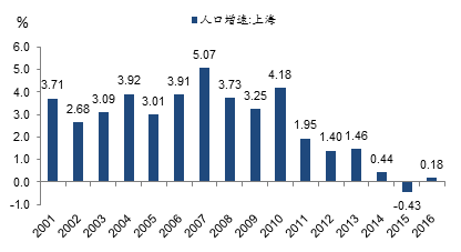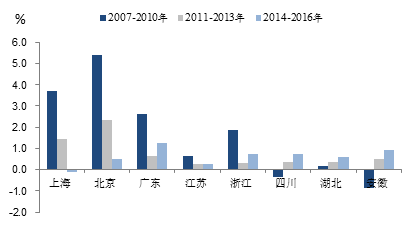 我国东部沿海地区中,人口流入增速明显减少的是江苏省。2007-2015年,江苏省人口净流入规模逐年减少,2016年常住人口仅增加22万人,这主要靠本省新生人口的贡献,而来自外省市人口的流入非常少。此外,江苏还是人口老龄化比较严重的省份,人口自然增长率不足千分之三。不过,广东和浙江在经历了2011-2013年常住人口增速减少之后,2014年以来人口增速再度加快,这表明其经济依然充满活力。
