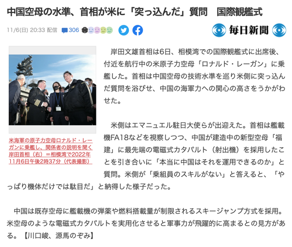 日本《每日新闻》报道截图报道称,在岸田文雄一行参观F/A-18舰载战斗机时,岸田文雄提到了中国目前正在建造的新型航空母舰“福建舰”使用最先进的电磁弹射器一事,并向美方提问称,“中国是否真的能操作这种电磁弹射”。当美方回答“操作人员缺乏技能”时,岸田表示“果然只有机体本身是不够的”,并表现出了满意的样子。