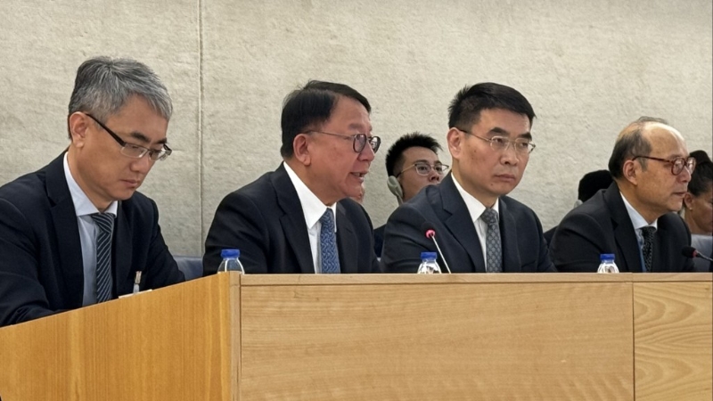 ▲政务司司长陈国基(左二)担任中国代表团副团长,出席联合国人权理事会会议。