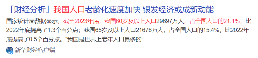 截至2023年末,全国60岁及以上的人口已达2.97亿人,占全国人口的21.1%,我国迈入中度老龄化社会。据此前预测,2035年左右,老年人口将突破4亿,我国将进入重度老龄化社会。《2024年1月18日新华财经客户端)。
