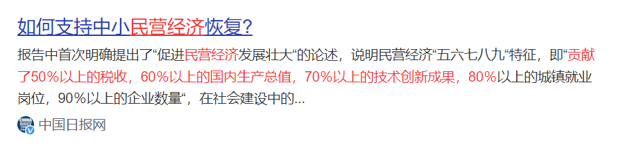 “56789”常用来概括民营经济在经济社会发展中的重要作用,即民营经济贡献了50%以上的税收,60%以上的国内生产总值,70%以上的技术创新成果,80%以上的城镇劳动就业,90%以上的企业数量。(中国日报网,2023年7月21日)