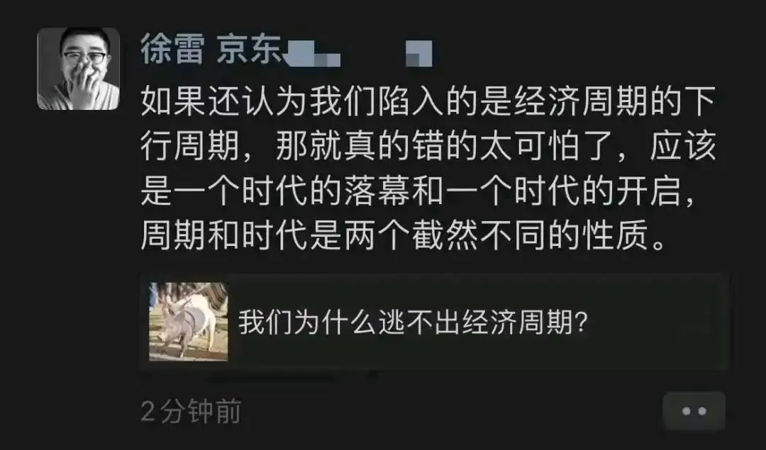 这几天,京东前CEO徐雷在朋友圈发的一段话,最近几天传播越来越广,他在转发“我们为什么逃不出经济周期”一文时,慨叹我们当下面对的到底是“周期”还是其他什么……