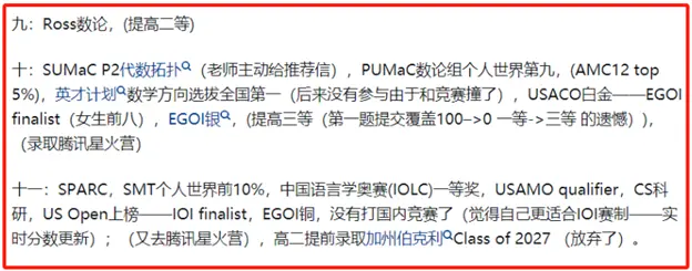她参加过各种数学类的有罗斯数学训练营(Ross)、斯坦福数学营(SUMaC P2代数拓扑)、普林斯顿数学竞赛(PUMaC数论组)、美国高中数学竞赛(AMC12)、英才计划。
