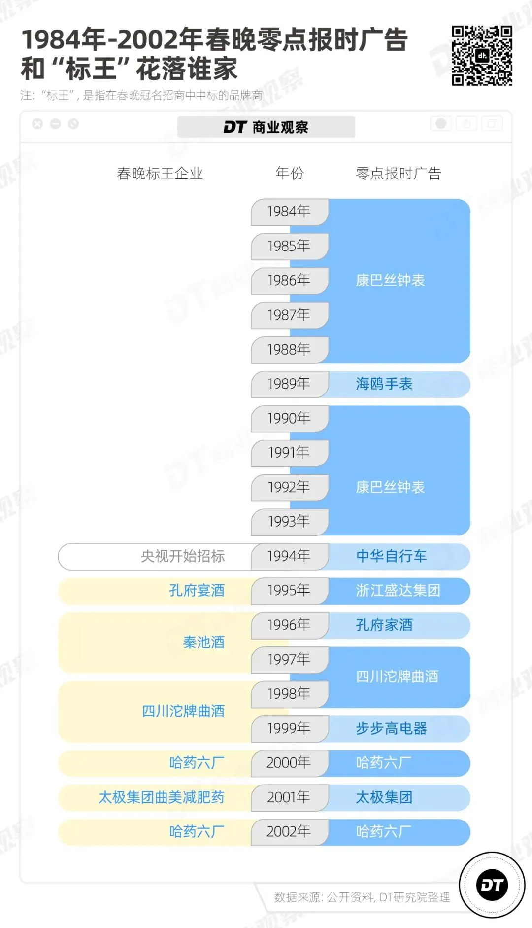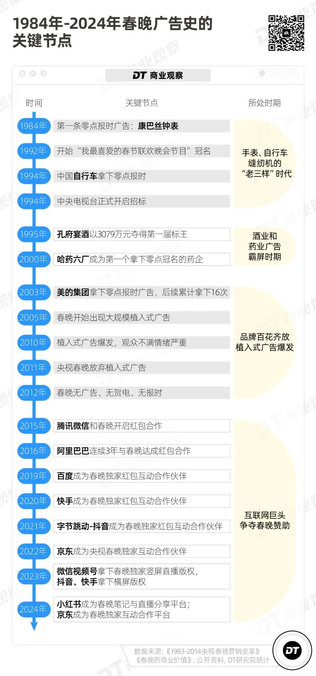 从1984年康巴丝钟表成为第一个春晚广告赞助商开始,到随后的古井贡酒、哈药六厂、美的集团,再到阿里、字节、抖音、小红书等互联网大厂……