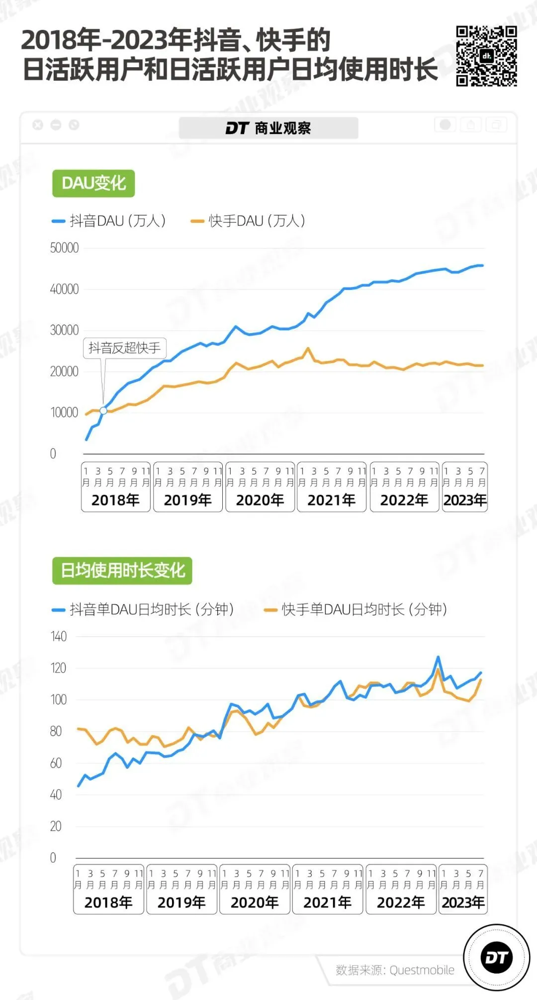 根据Questmobile数据,2018年,抖音的日活跃用户(即DAU,下简称“日活”)超过快手;2020年,抖音日活的日均使用时长也超过了快手。