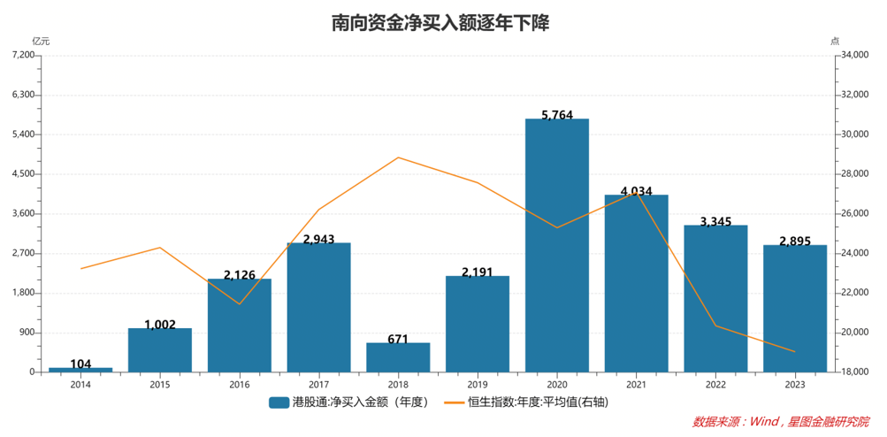 外资犹豫地缘问题尚可理解,南向资金一向喜欢港股的性价比,近年来对港股的抄底意愿也在逐年下降。2023年,南向资金净买入港股2895亿元,较2020年已经腰斩。估值层面,港股性价比越来越高,南向资金流入意愿却越来越低。
