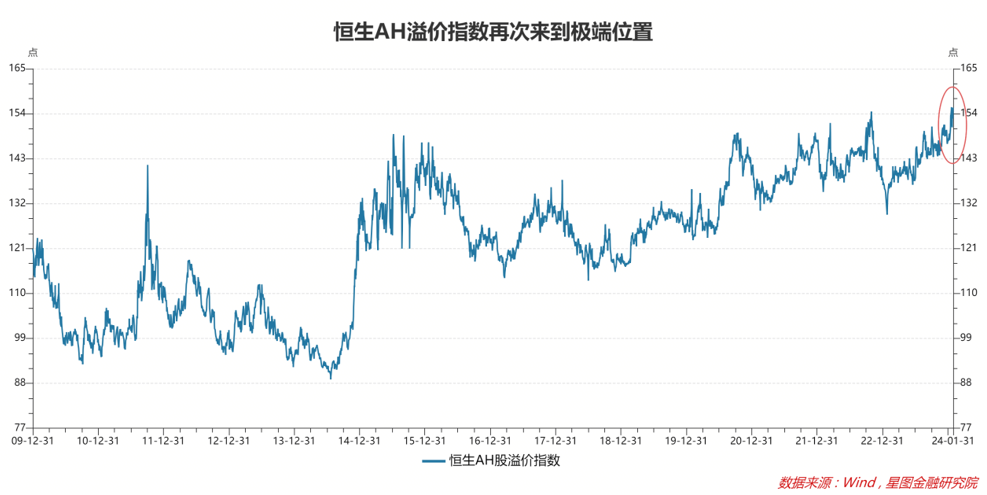 通常,市场会用AH溢价指数来衡量港股性价比。计算公式为,AH溢价指数=∑(A股价格*总股本*汇率)/∑(H股价格*总股本)*100,衡量两地上市公司在A股与港股的估值倍数。1月31日,恒生AH溢价指数收于155.48点,意味着同一只上市公司的A股股价平均比港股高55.48%。