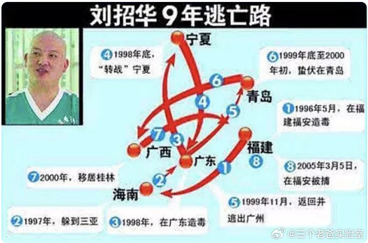 10:钱花差不多了之后,他跑广东普宁结识了当地大毒枭陈炳锡,几次接触下来,陈炳锡发现这是个人才啊,两人一拍即合,陈炳锡做CEO负责启动资金,运营和销售,刘招华做CTO负责生产制造。在普宁期间刘招华还结识了三老婆,和三老婆拍了一套婚纱照,由于效果好,被影楼用来做灯箱广告一年也没人发现是个通缉犯。