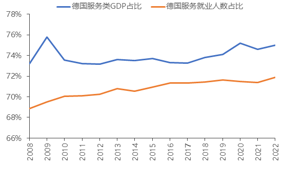 事实上,服务业在三次产业中的占比最高是全球各国的普遍现象。即便是全球最具有“工匠精神”的制造业强国——德国和日本,2022年其服务业对GDP的贡献分别为75%和73.6%,就业的贡献分别为71.9%和72.1%。