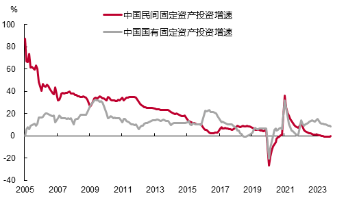民间投资增速之所以在过去20年中出现巨大落差,应该与制造业的产能过剩和房地产长周期的下行有关。但地方政府和国有资本要担负稳增长的任务,因此,在房地产投资增速大幅回落的背景下,通过加大基建和制造业投资力度来实现稳增长目标,这就导致了债务增长过快的问题。