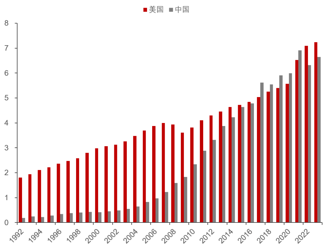 中美社会消费零售总额比较(万亿美元)数据来源:wind,美国人口普查局,中泰证券研究所